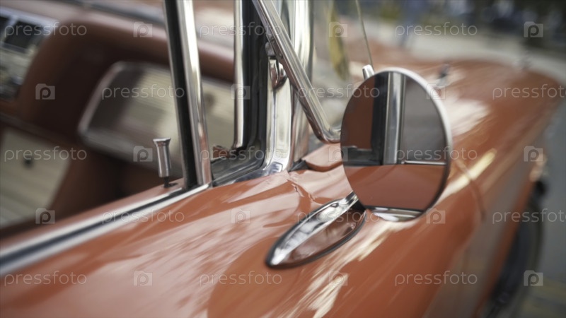 Подробности красного ретро-автомобиля на размытом фоне города Закройте круглое зеркало старой полированной блестящей красной машины