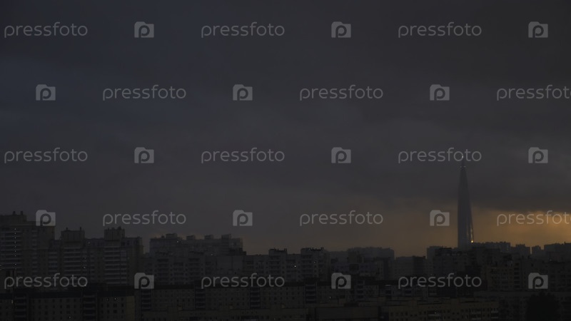 Lakhta Center в Санкт-Петербурге на закате, Россия Концепция. Высокое здание, окруженное жилыми домами, бизнес-центр на тяжелом фоне захода солнца, эффект замедления времени