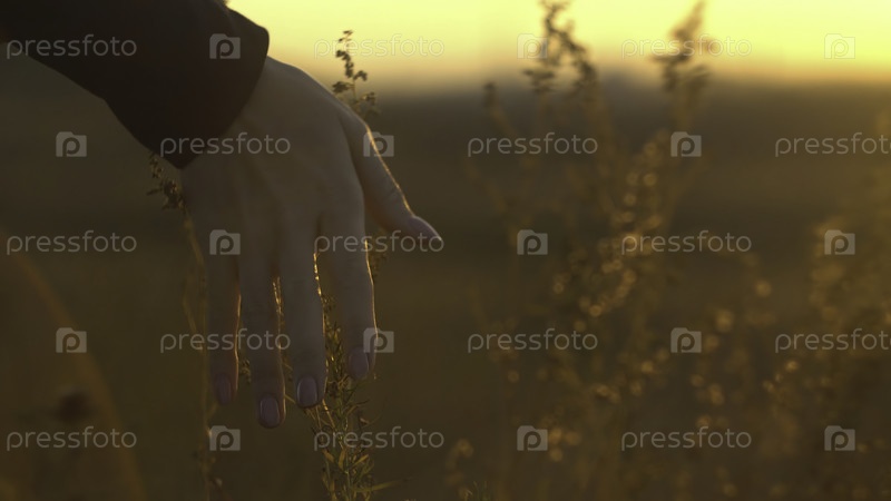 Рука на закате солнца в степной траве, касающаяся своей рукой степейной травы под солнцем