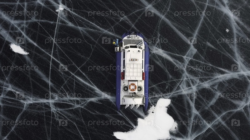 Вид спасательной лодки на замерзшем озере с толстым слоем прозрачного трещины льда