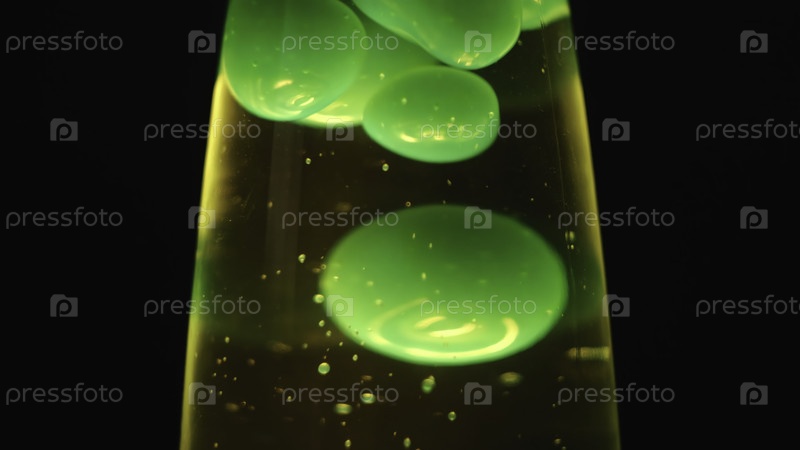 Закройте вид на зеленую лавовую лампу, изолированную на черном фоне. Концепция. Необычная лампа с тусклым светом и движущимися зелёными пузырями создает расслабляющую атмосферу