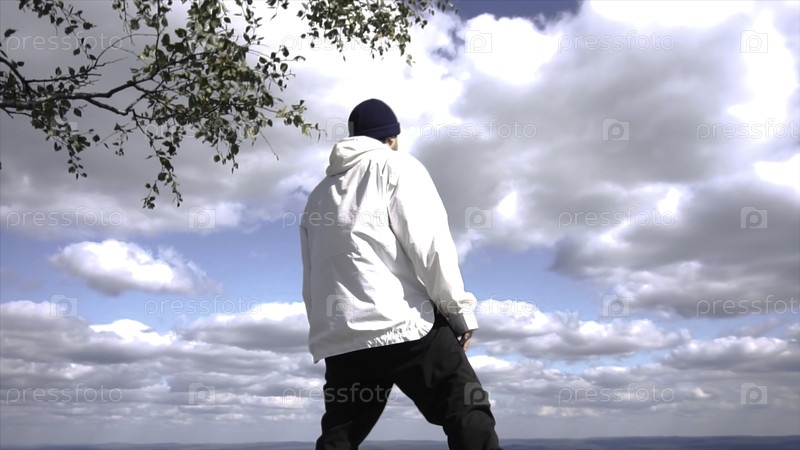 Обратный вид человека, стоящего против неба и смотрящего на горизонт. Кадры. Одинокий человек в гармонии с природой. Концепция поиска смысла жизни