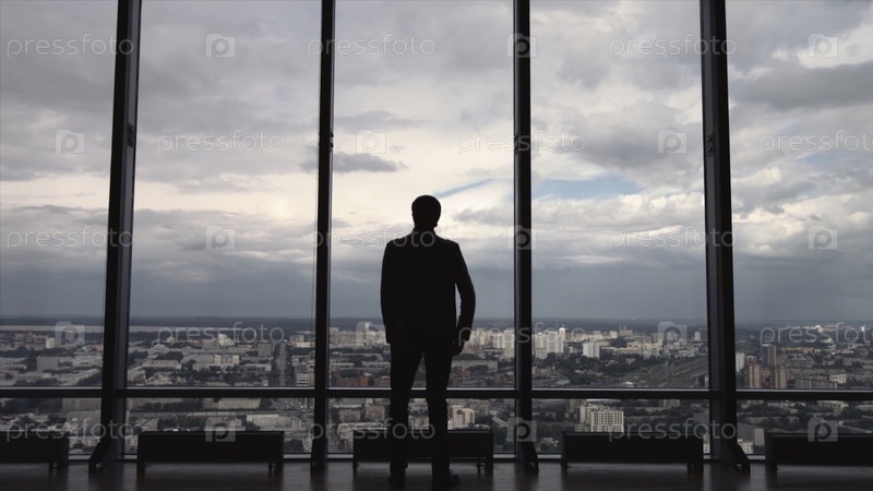 Сзади мужчина в официальных апартаментах, которые стоят перед панорамным окном с видом на город