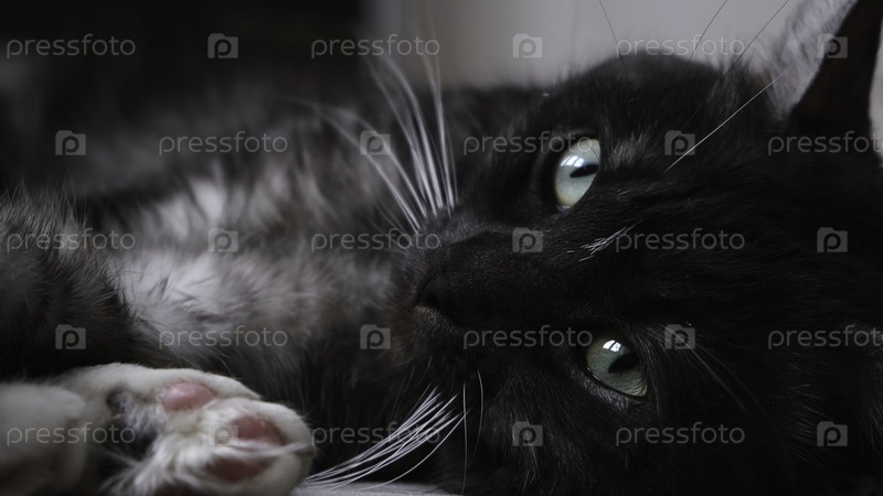 Сонный черный кот с большими зелеными глазами, лежащий на полу на размытом фоне. Концепция. Красивое животное в чёрно-белом цвете, лежащее с мягкими лапами на фоне камеры