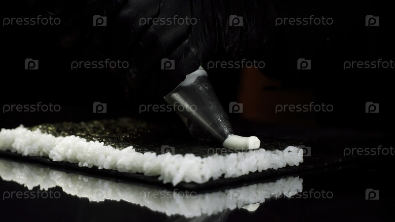 Покрывайте руки черными перчатками, выжимая сливочный сыр из специального трубчатого пакета на суши-риз, изолированный на чёрном фоне
