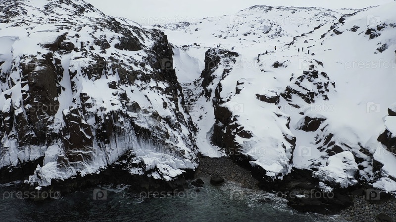 Воздух крутых скал, покрытых белым снегом и голубым морем, красота зимней природы.Летайте над красивым каменистым побережьем в зимний сезон