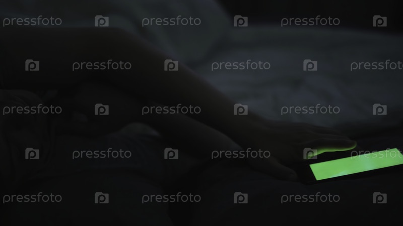 Молодой человек рано утром просыпается с мобильным будильником со зеленым экраном. сонный парень просыпается после того, как услышит будильник на своем смартфоне, достает звонящий мобильный телефон и использует его