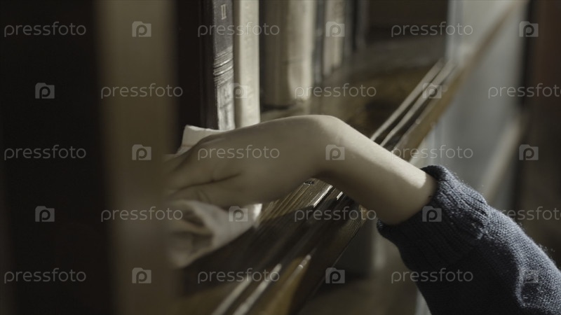 Покрывайте руку вашего ребенка, когда вытираете пыль с книжной полки. Ребенок чистит полку. Рука мальчика очищает книжную полку. Вытирает пыль. Вид на ребёнка, который убирает книгу и стирает пыль