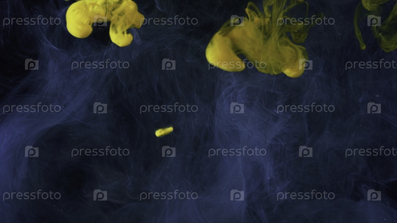 Красивые желтые капли краски, разбросанные в воде. резервная запись. закрывающиеся облака жёлтого и синего чернил, выделенные на чёрном фоне, концепция искусства