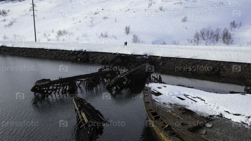 Вид с воздуха на кладбище старых ржавых кораблей у снежного побережья холодного моря в зимний сезон.Путешествие над разрушенными лодками и заснеженными холмами возле тихого моря