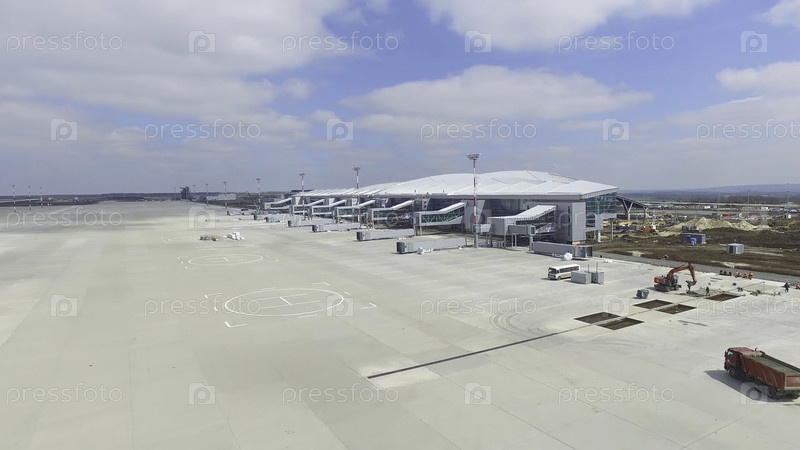 Вид из воздуха на современный терминал международного аэропорта. Путешествие по всему миру. Пустой аэропорт. Вид на взлетно-посадочную полосу в аэропорту. Маркировка аэродрома на подъездной дороге, направляющаяся к взлетно-посадочной полосе