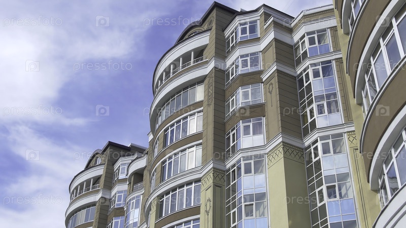 Современный, роскошный многоквартирный дом. Роскошное жилое здание с бетонной дорожкой над передним двором. Часть фона синего неба