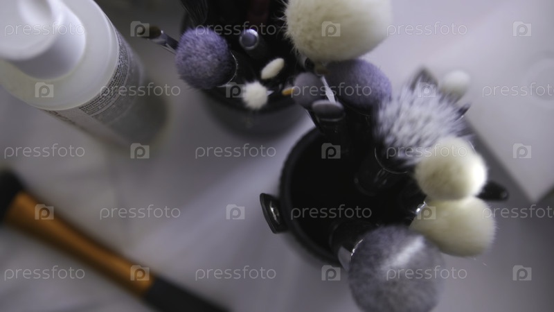 Закройте набор инструментов для макияжа против белого стола. Клип. Вид многих различных косметических кистей в очках, концепция индустрии красоты