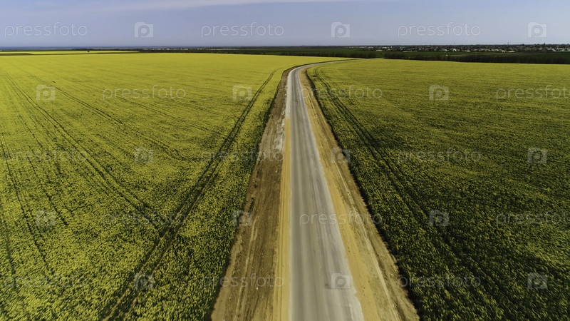 Воздух для асфальтированной дороги между желтыми полями на фоне синего неба. потрясающий сельский пейзаж с дорогой и лугами с цветками рапса
