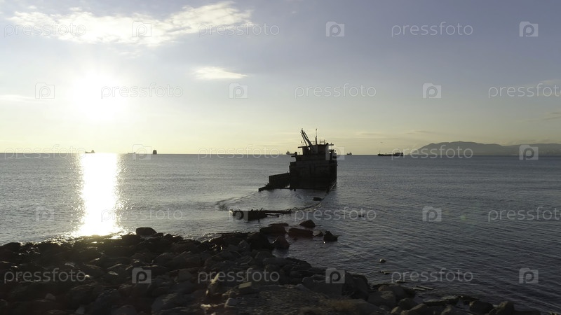 Воздух для кораблекрушения вдоль скалистого побережья против сияющего солнца.Стрельба.Старая затонувшая лодка недалеко от морского берега на фоне большой горы и синего неба