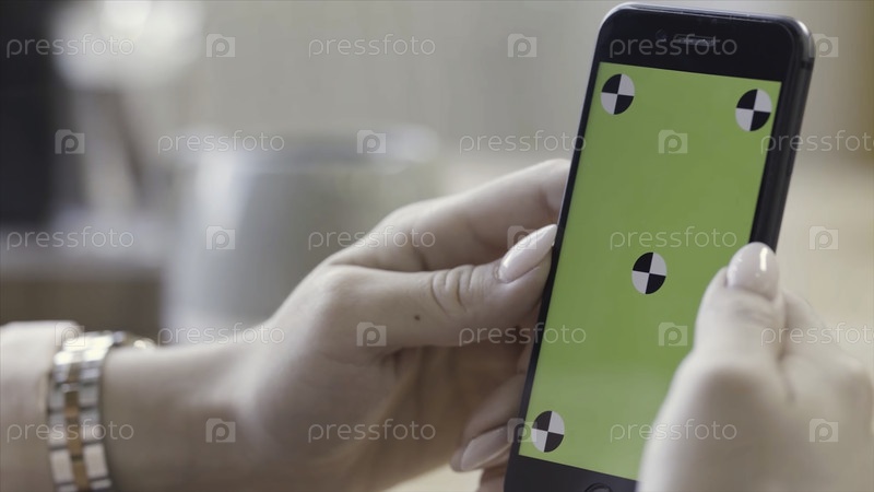 Закройте руки женщины, удерживая смартфон с зеленым дисплеем в вертикальном положении. резервные записи. женщина смотрит на свое устройство хроматической клавиатурой и следами