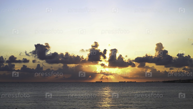 Впечатляющий морской пейзаж с яхтами на море при закате солнца. романтический вид яркого заката над спокойным Черным морем со парусниками и яхтами