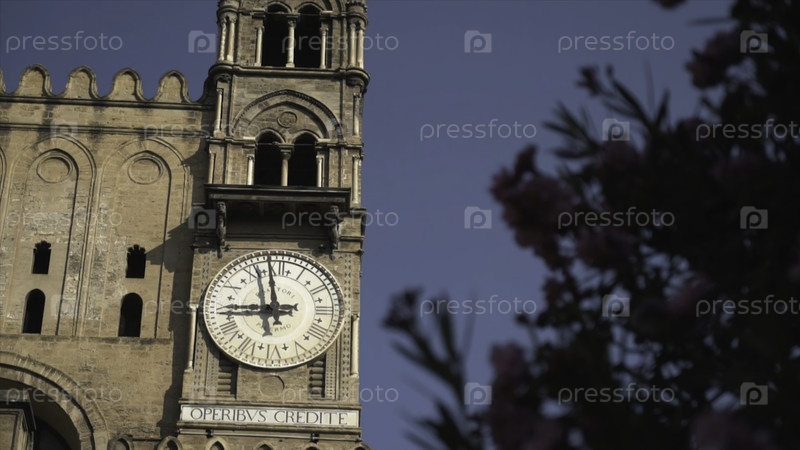 Ниже представлен вид старой часовой башни на фоне чистого голубого неба. Продолжайте. Детали древнего красивого здания с круглыми старыми часами на кирпичной башне, концепция архитектуры