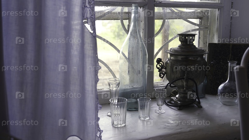 Древние блюда русской жизни. резервные кадры. сервис установлен с разрезанным стеклом и бутылкой на фоне самовара. Стекло Glass Glasses of Russian Country Life