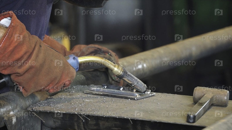 Промышленный работник на сварке нефтеперерабатывающего завода закрывается. Металлическая пила близка. Клип. Закрытие сварщика, работающего в мастерской