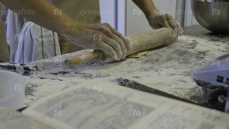 Детали женской руки скручивают тесто булавкой при изготовлении домашней макаронки