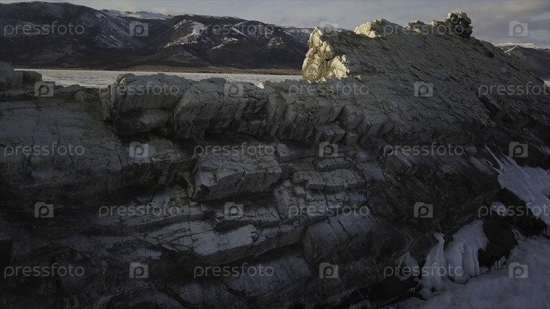 Вид с воздуха на скалу со крутыми склонами на фоне лесистых гор и замерзшего пруда. горы с вершинами, частично покрытыми снегом красивое замороженное озеро Байкал под синим небом