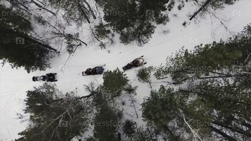 Аэрофотосъемка команды, остановившейся во время путешествия по зимнему лесу на снегоходах. Клип. Спортсмены на сноумобилях готовы двигаться по глубоким снежным днурам в зимнем лесу