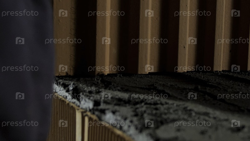 Кирпичник закладывает еще один ряд кирпичей на стройплощадке. резервные кадры. покрыть человека защитными перчатками, положив тяжелый кирпич на миномет