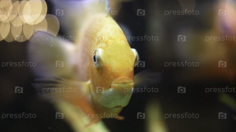 Макросы покрывают лицо замечательной золотой рыбки в аквариуме. Рамка. Золотая рыбка открывается, закрывает рот и движется плавником, подводная жизнь