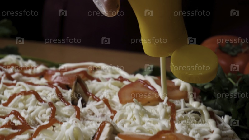 Руки делают пиццу. Рамка. Готовить на кухне, помещая ингредиенты в пиццу. Концепция пиццы. Производство и доставка продуктов питания. Рука шеф-повара пекаря в белой форме делает пиццу на кухне