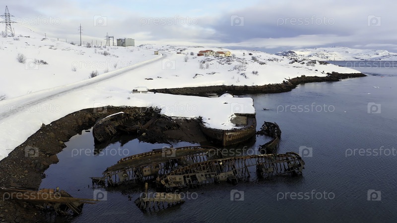 Вид с воздуха на зимнее заснеженное побережье моря со кораблекрушениями после корабельного крушения. Фильмы. Старые затонувшие рыбацкие лодки на берегу Баренцева моря