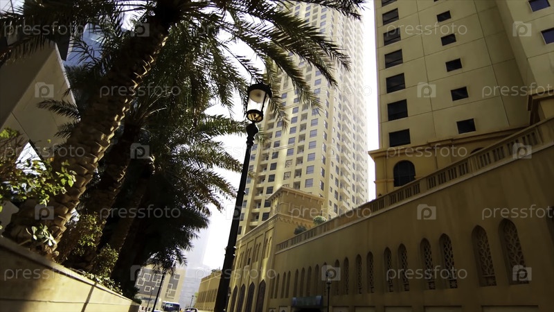 Широкая дорога с высокими пальмами и современными зданиями