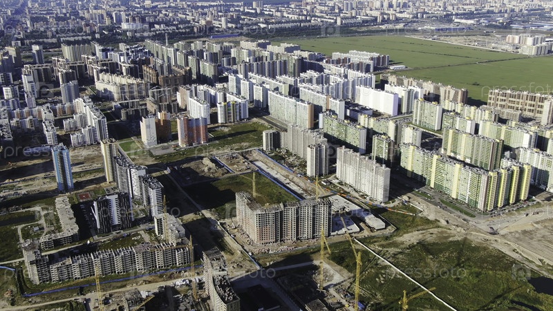 Вид из воздуха на новые современные жилые комплексы в большом городе с дорогами, парковками и детскими площадками.Движение.Вид на современное здание в Московской области
