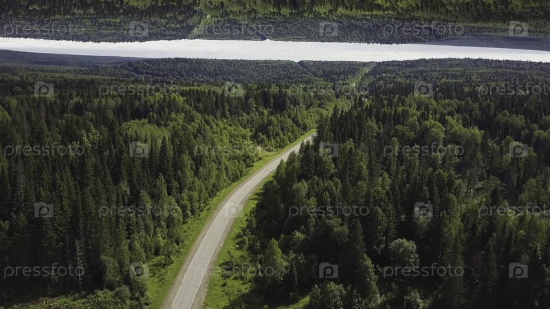 Вид с воздуха на изогнутую пустую дорогу в лесу в летний день, эффект зеркального горизонта Зеленый лесной загородный путь, вид сверху, тема происхождения