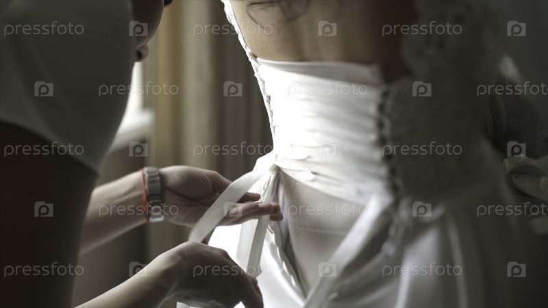 Стильные красивые подруги невесты помогают великолепной брюнетке в белом платье подготовиться к свадьбе, утренние приготовления, женщине надевать платья