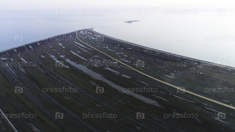 Сверху вид на поле луга рядом с берегом моря и желтую сельскую дорогу.Воздух для заброшенного затопленного зеленого поля в пасмурный день