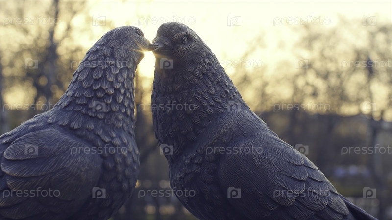 Пара старинных белых голубей, сделанная из бронзы и солнечного фона. металлические статуэтки голубя. две фигуры голубей как памятник любви. монумент любви в бронзе