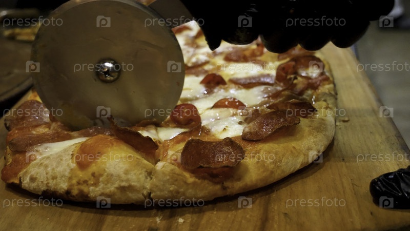 Покройте руки пекаря в черных кулинарных перчатках, режущего пиццу на кухне, вкусная итальянская концепция еды.Человек разрезает свежеприготовленные ломтики пиццы специальным ножом