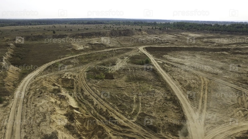 Воздух для красного грузовика, едущего по сухой земле сельской дороги с зеленым сосновым лесом и голубым небом на заднем плане