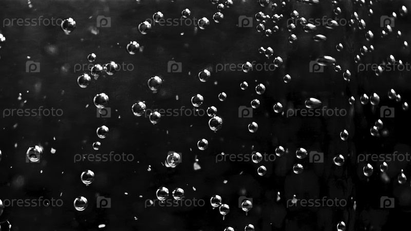 Закройте круглые прозрачные кислородные пузыри, медленно изолируя от черного фона, монохромный