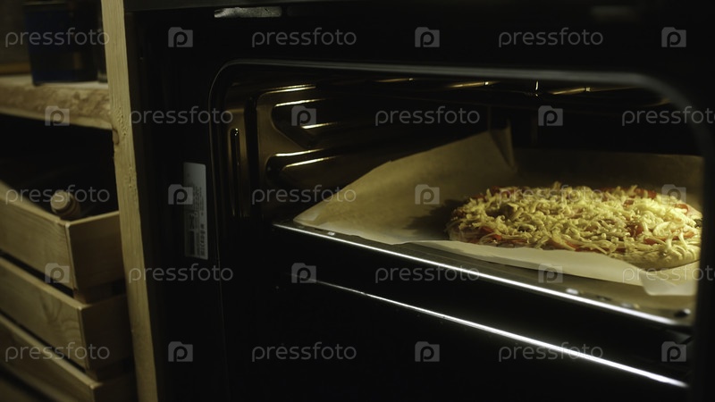 Руки человека прикладывают пиццу к современной промышленной печи на кухне. резервные кадры. традиционная итальянская еда