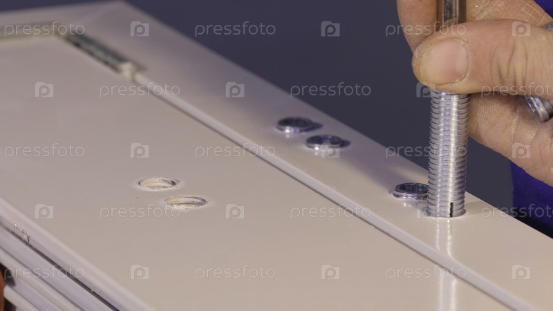 Установка аксессуаров для пластиковых окон из ПВХ. Свинцовочки или сверло. Человеческие руки Закрепите ручку окна Электрическая отвертка. Температурные плавучие стеклянные панели. индустрия