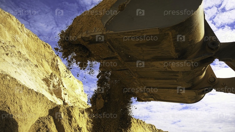 Экскаватор, работающий на стройплощадке. Резервные кадры. Нижний вид экскаватора, переворачивающего жёлто-цветное ведро с песком на фоне синего облачного неба