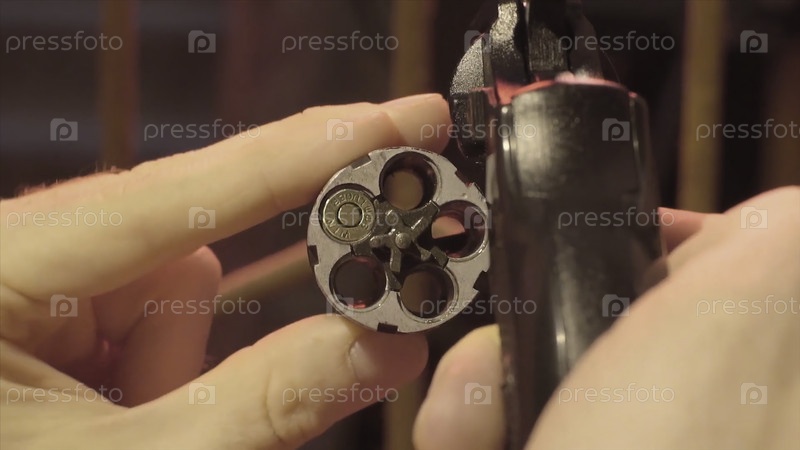 Рука мужчины перезаряжает револьвер. пушка Magnum без патронов, револвер Magnum и пустая пуля Magnum. 45 выстрелов