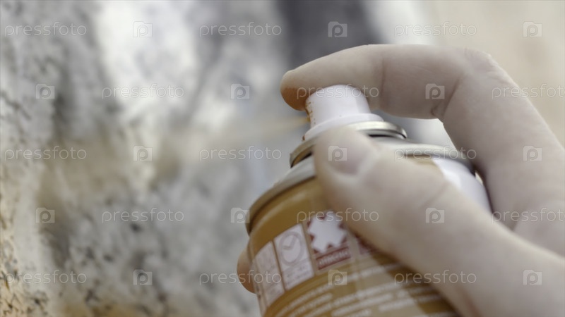 Клубовый снимок художника рисует уличное искусство, распыляя краску. Продолжайте. Витриновые пальцы художника держат банку цветной краски на бетонной стене. Уличный художник в процессе создания граффити