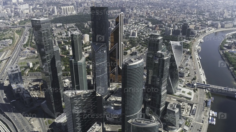 Панорамный вид на финансовый район Москвы с красивыми небоскребами и голубым небом в фоне.Международный бизнес-центр, стеклянные чешуи для фасада