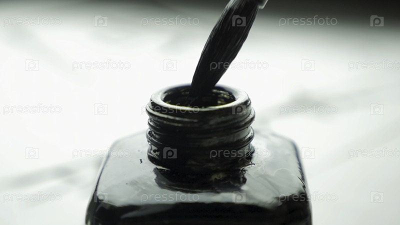 Женская рука кусает кисть в банке с затягивающим чернилом. Китайская старомодная краска со селективной фокусировкой. Подробная информация о китайской кисти при рисовании линии на спине мира 4K