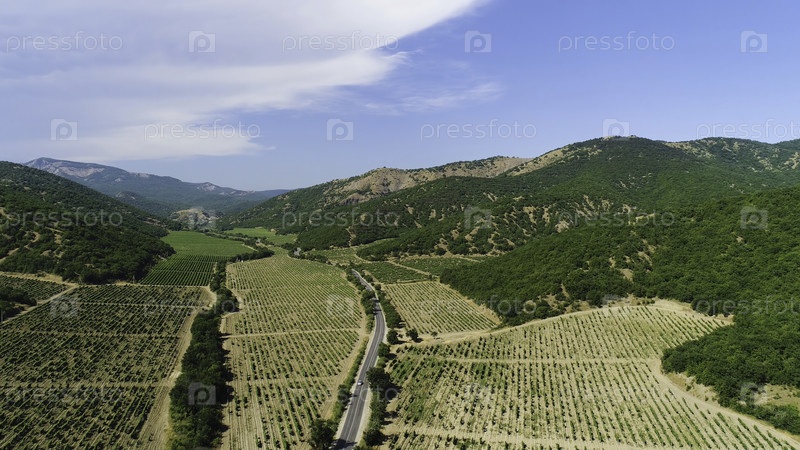 Вид с воздуха на красивые сельскохозяйственные поля со растущими растениями на фоне голубых облаков.Стрельба.Летание над зелеными лесистыми горами по дороге и полям
