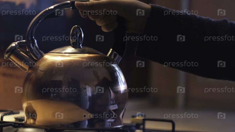 Закрытие молодой женщины отразилось на полированной поверхности стального чайника, поместив его на газовая печь