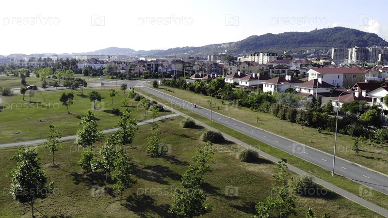 Вид на загородные коттеджи с красными крышами на фоне гор. Клип. Дорогие домики с красной кровлей расположены вдоль побережья на фоне гор